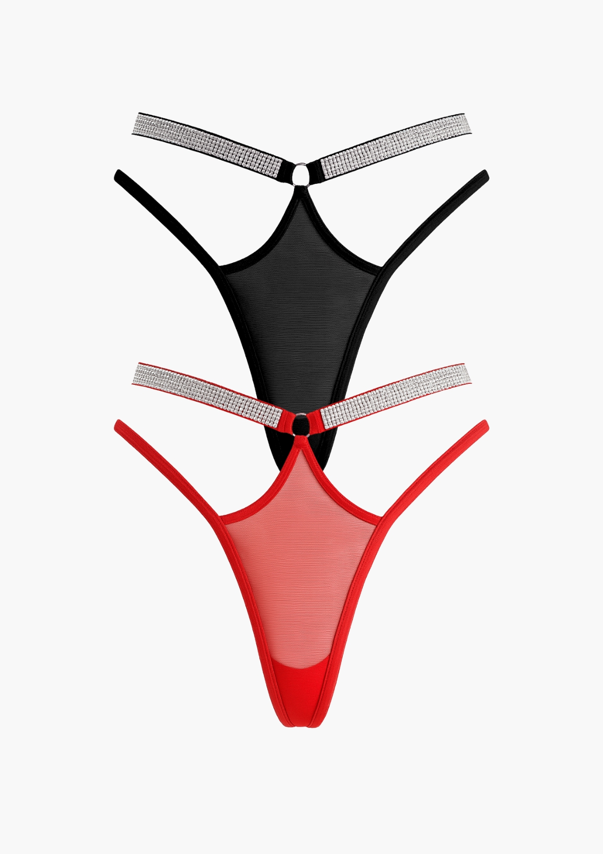 Because sensuality meets comfort in this exclusive 2-pack of thong panties, designed for women who want to feel confident, sexy and stylish. With a flattering transparent mesh finish and shimmering rhinestone straps, these panties elevate every look.