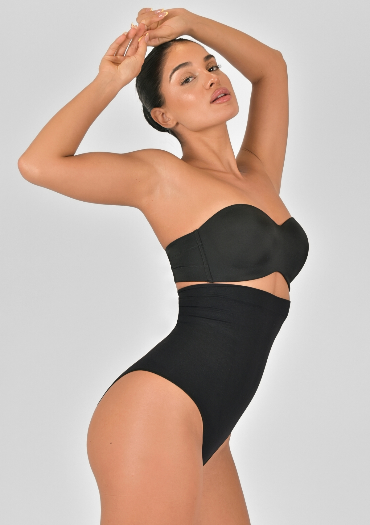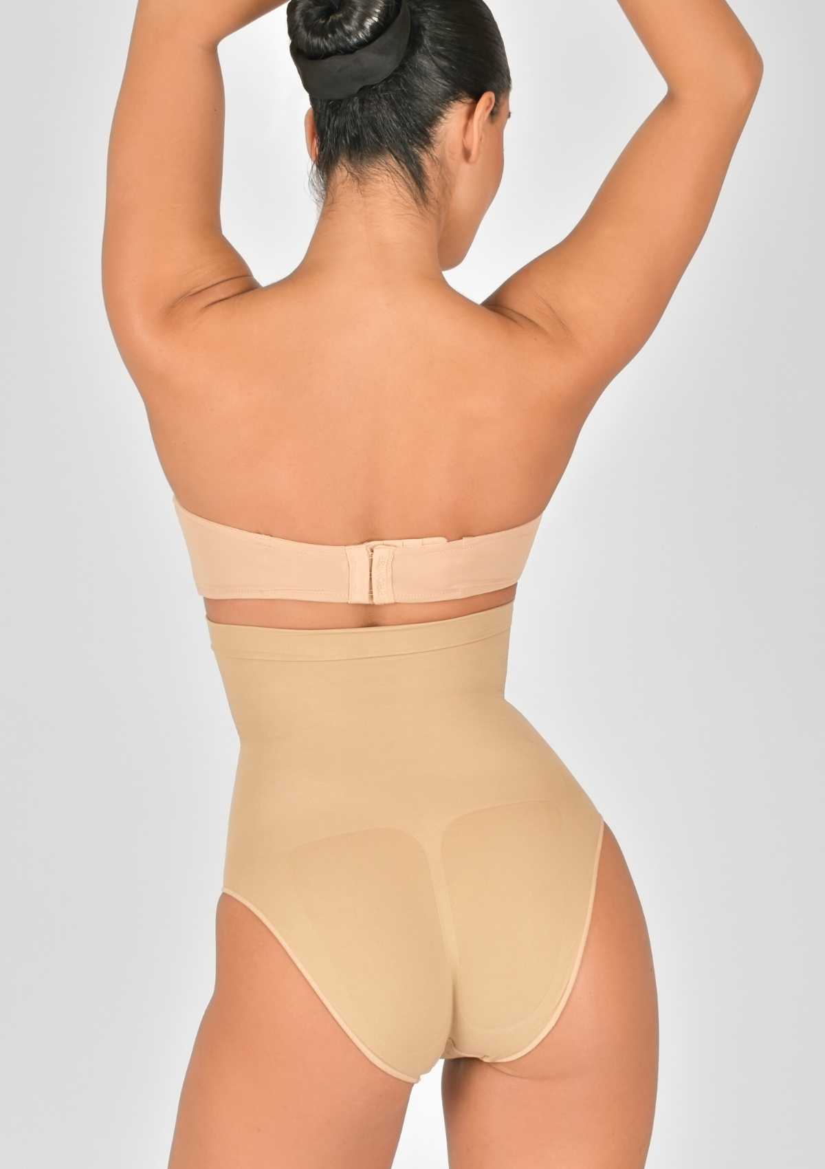 High-waisted shapewear brief with firm tummy and waist compression. Seamless, invisible, and breathable with a secure silicone band and cotton gusset.