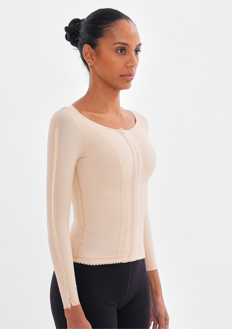 The long design covers the entire chest, arms, and upper abdomen, ending at the tummy for full, even compression. Molded breast cups with flat seams prevent irritation and enhance comfort.