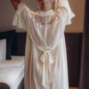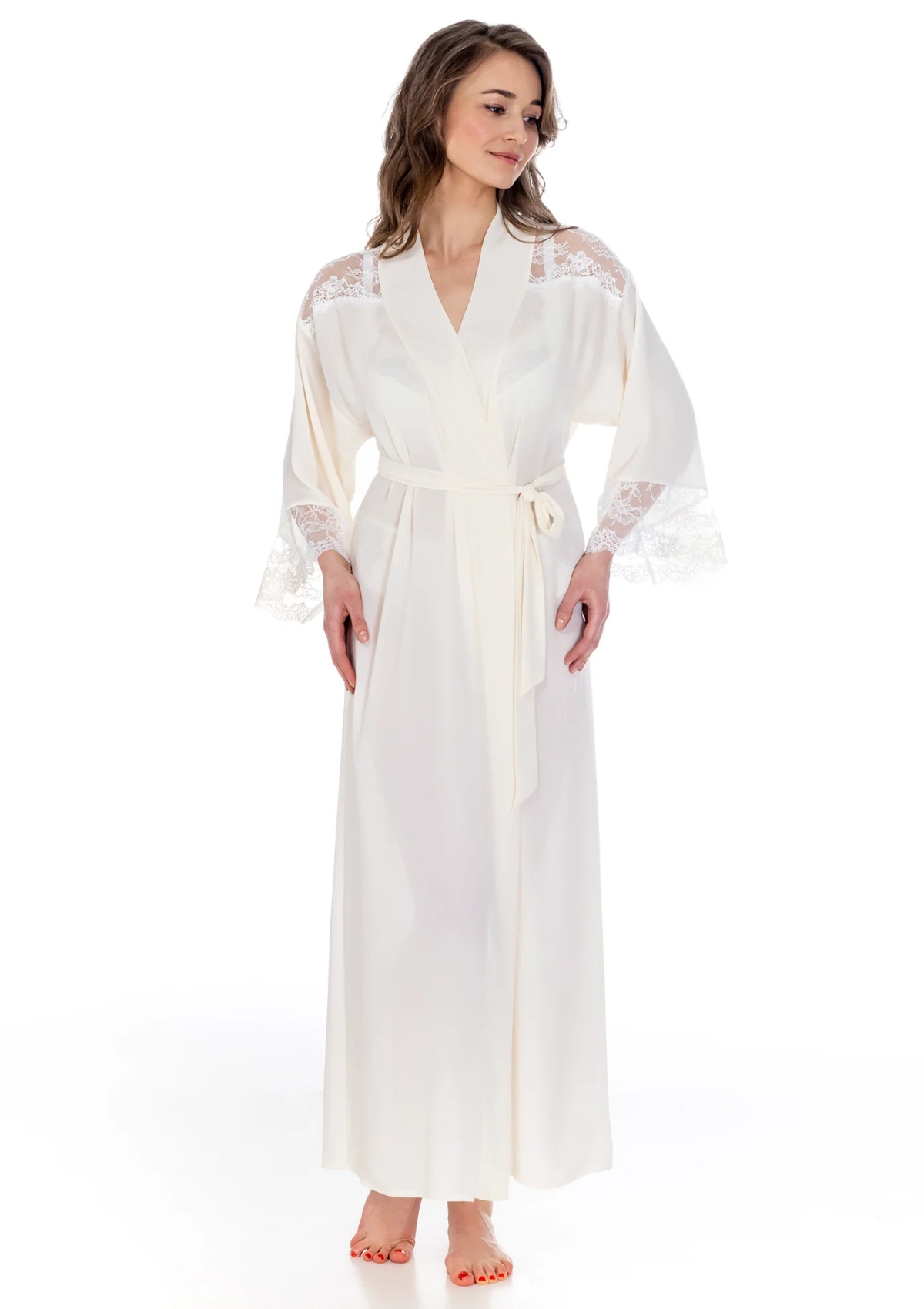 Crafted from light crepe-chiffon, it feels soft and breathable, perfect for wedding mornings, honeymoons, or intimate evenings. The rich lace trim adds a timeless romantic detail, while the belt tie closure ensures a flattering adjustable fit. Its maxi length makes this robe a graceful and unforgettable piece.
