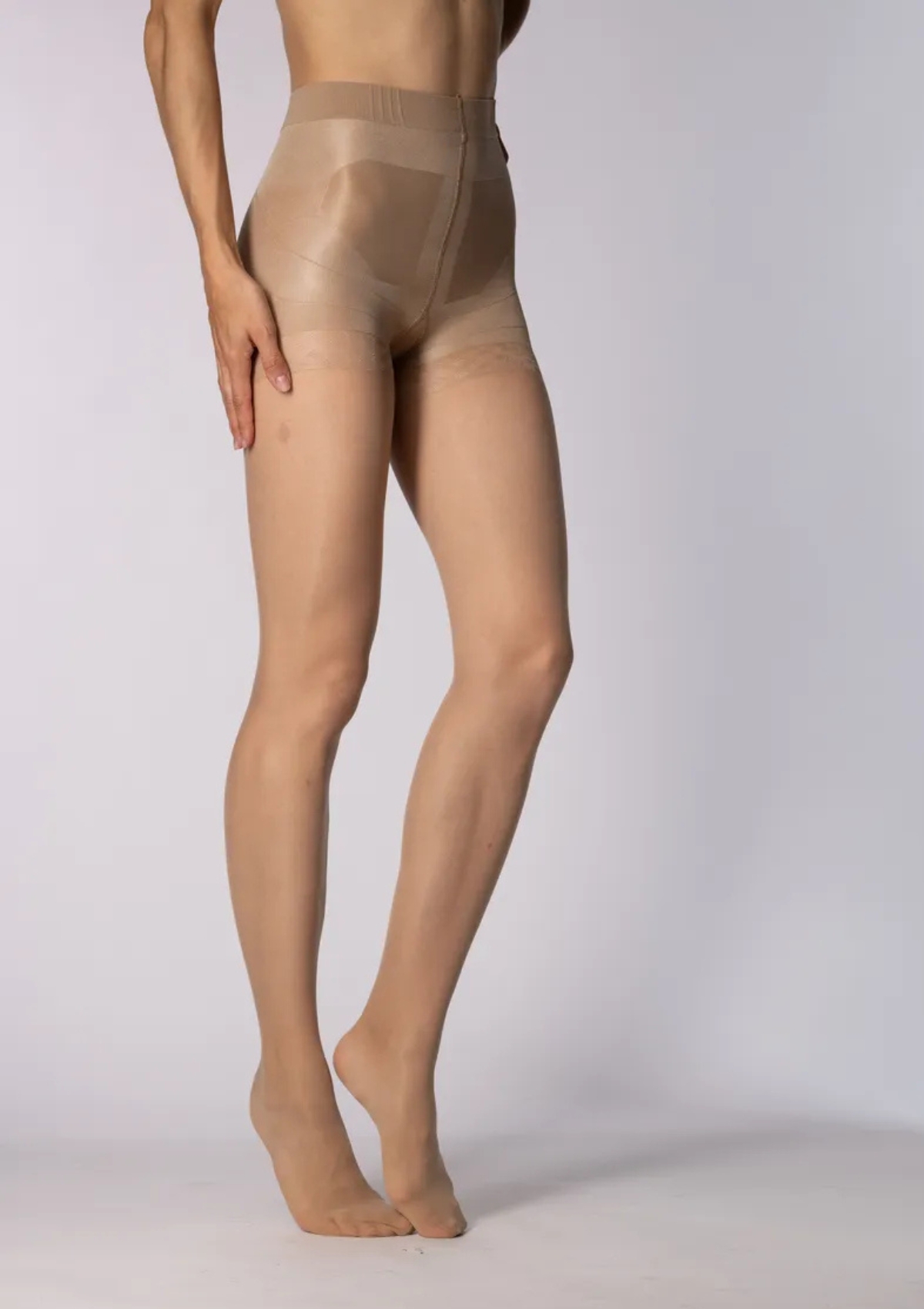 Sheer 20 DEN push-up tights in natural shade. Smooth tummy, slim waist & lift buttocks. Lightweight elegance with shaping support.